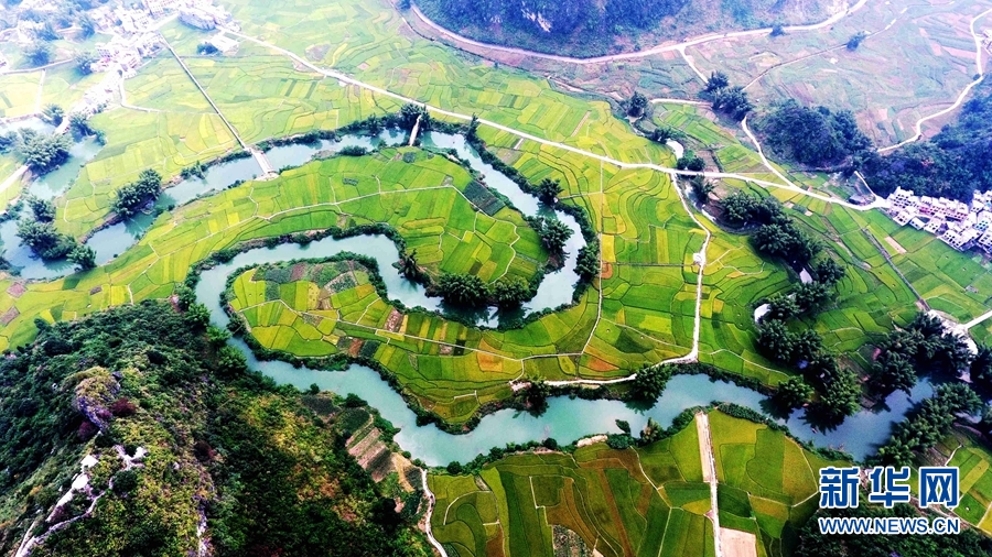 碧绿的河水在河池市东兰县武篆镇江平村的田野上形成一个巨大的“太极”图案。高东风摄