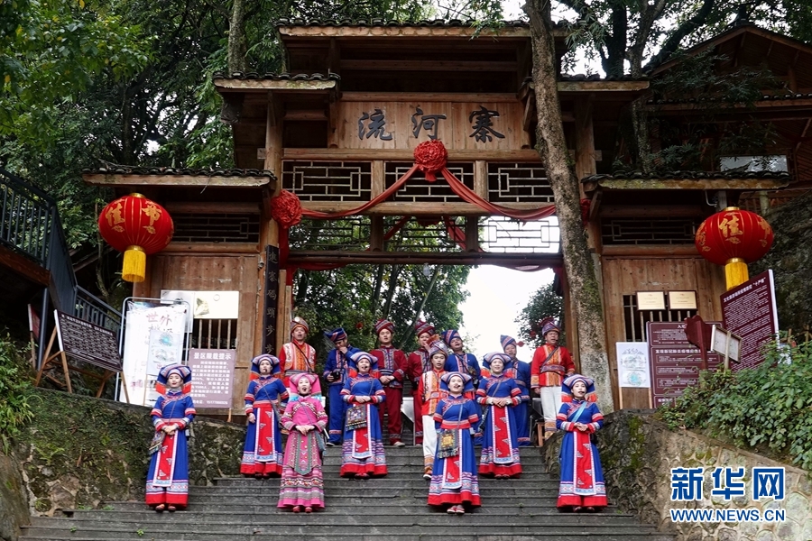河池市宜州区壮族群众在三姐故里流河寨唱山歌迎宾。高东风摄