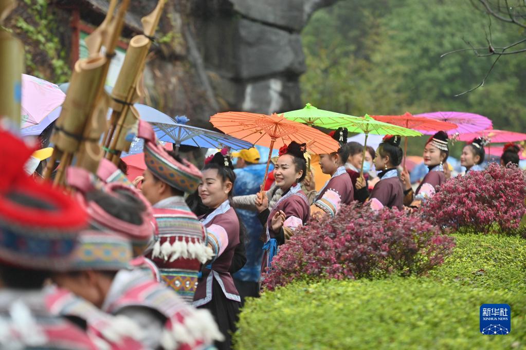 3月19日,在广西融水苗族自治县双龙沟森林旅游度假区,苗族同胞用歌舞欢迎来自广东省湛江市的游客。