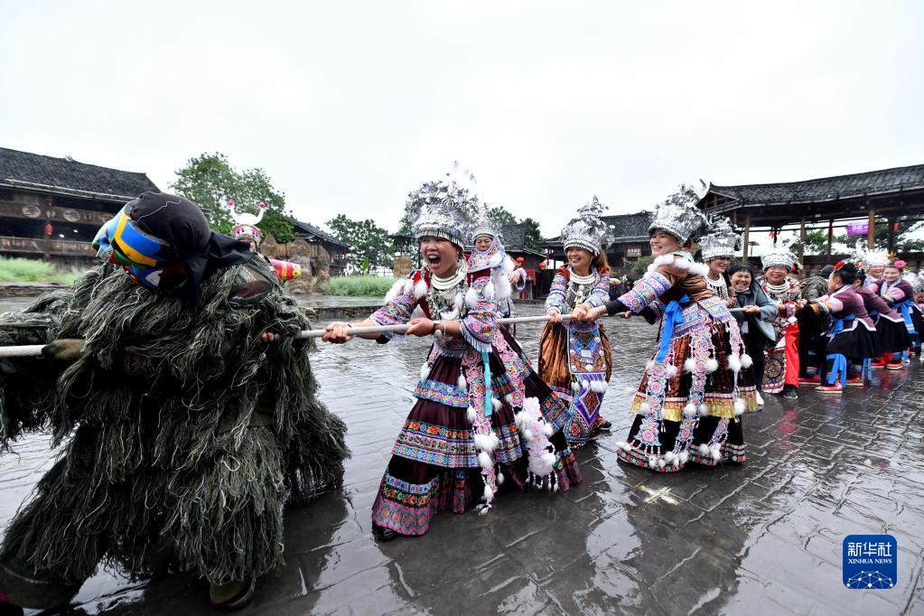 3月19日,在广西融水苗族自治县双龙沟森林旅游度假区梦呜苗寨,来自广东省湛江市的游客在体验当地民俗。