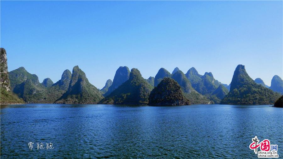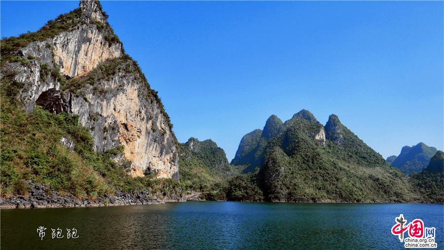 乘船游大龙湖,秀美湖色风光在身边掠过:白龙飞天、睡美人山、鲤鱼山、企鹅山等,既有桂林漓江少女般的清秀迷人,又有越南下龙湾美男子般的伟岸气势,连绵的石山让人感觉若有若无,隐隐约约,宛如一幅山水国画,让人啧啧称奇。