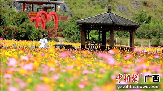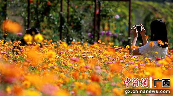 初冬暖阳下的旧州花海,橘的、黄的、粉的,随风摇曳、轻盈曼妙。这时,轻轻走进花海里,静静地置身其中,有一种误入人间仙境的错觉。