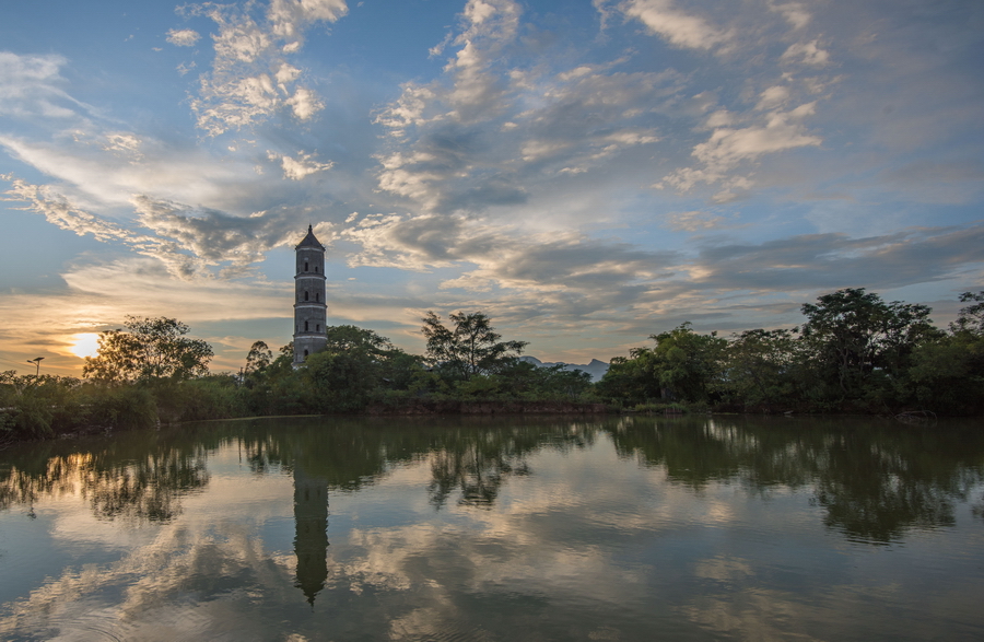 9月5日,多彩晚霞映衬下的蓉峯古塔与美丽多姿的田园美景形成一幅美轮美奂的摄影水彩画。(黄海摄)