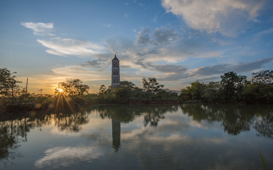 蓉峰塔,座落于宁明县城西郊,始建于清代1821年,距今已有200年历史。蓉峰塔高43.44米,共五层,从二层起,分别题名为“珠连“、“璧合“、“梯云“、“取月“;配有“苍龙布水“、“彩凤独立“、“瑞鹿含芝“、“金鲤朝龙“为题的壁画。塔顶为尖嘴葫芦状,瓦檐六角各垂吊一个风铃。塔侧有一古榕,绿色枝叶拦腰拥抱古塔,形成树抱塔的奇观。塔东侧有一小湖,登塔眺望,荷城新姿、明江秀色、田园风光尽收眼底,是宁明县三山四水十大景中的经典景点之一。(周贻刚)