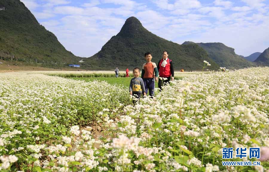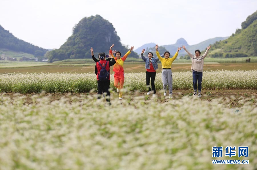 游客在柳州市柳城县古砦仫佬族乡独山水库库区的荞麦花丛中游玩;