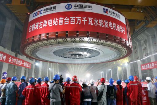 图为 哈电集团研制的首台白鹤滩百万千瓦机组转子吊装成功