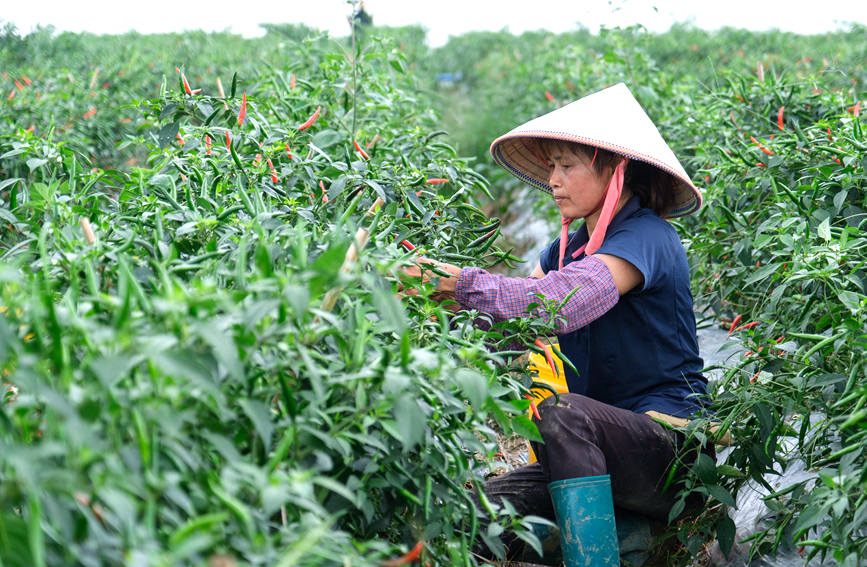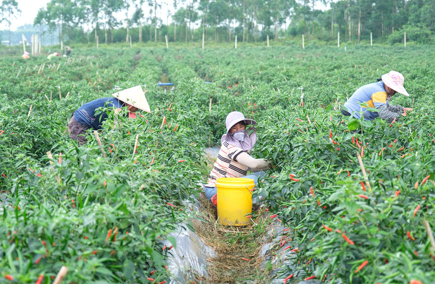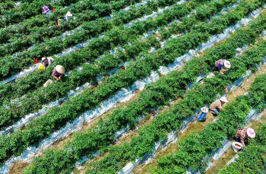 村民在辣椒基地采摘辣椒。张晓冬摄