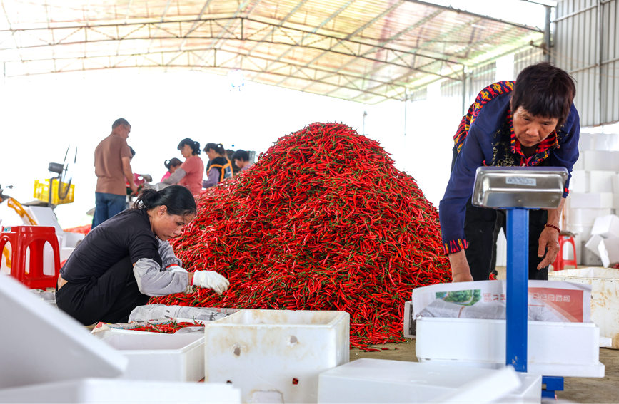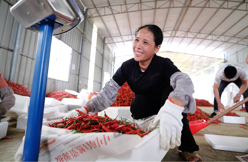 工人在打包称重辣椒。陆敏摄