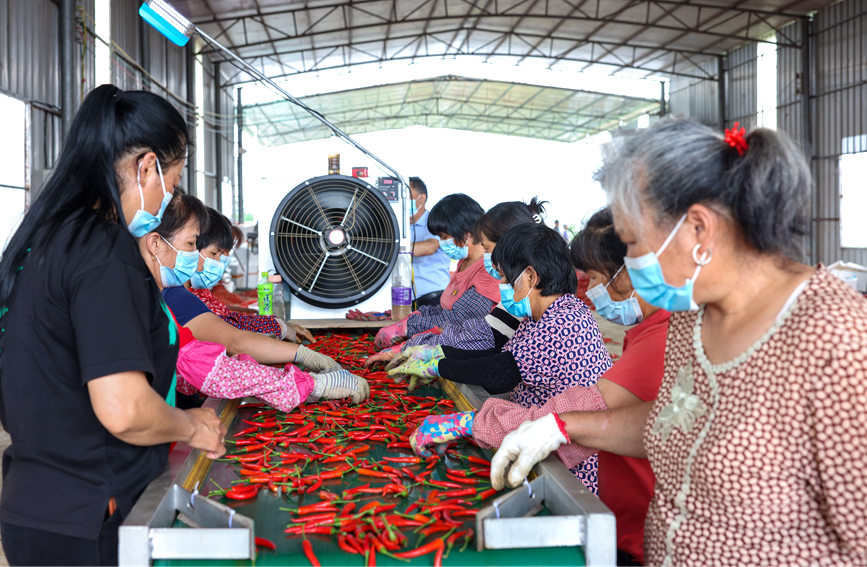 工人在挑选辣椒。陆敏摄