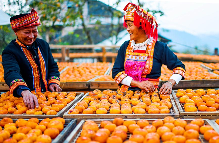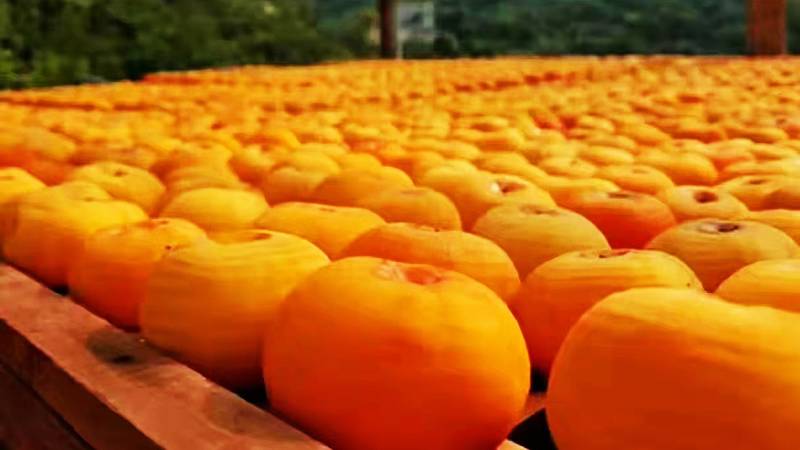 瑶族群众正在将晒场的柿子翻面,以便更好地风干。平乐县融媒体中心供图