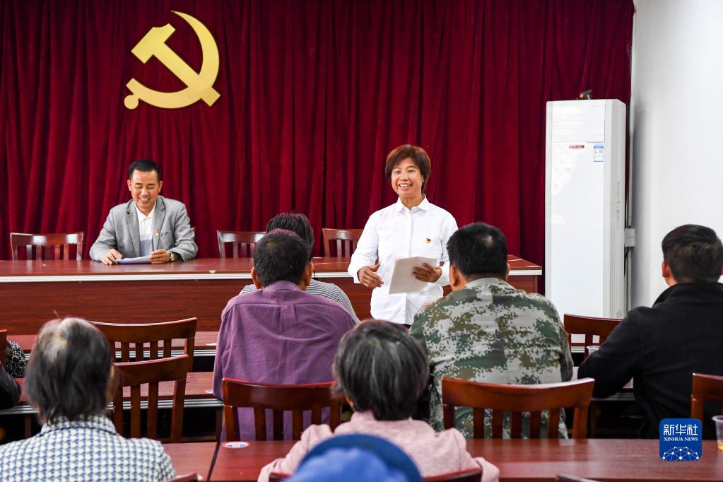 12月10日,在蓬塘村白雪塘党支部党员大会上,卢花暖(站立者)在发言。