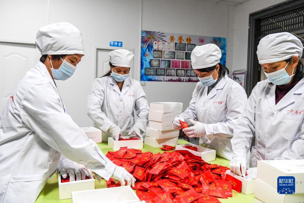 12月10日,卢花暖(左一)和其他茶农一起包装待售成品茶。