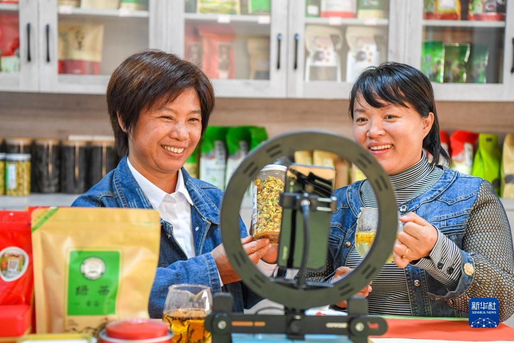 12月10日,卢花暖(左)和同伴一起直播卖茶。
