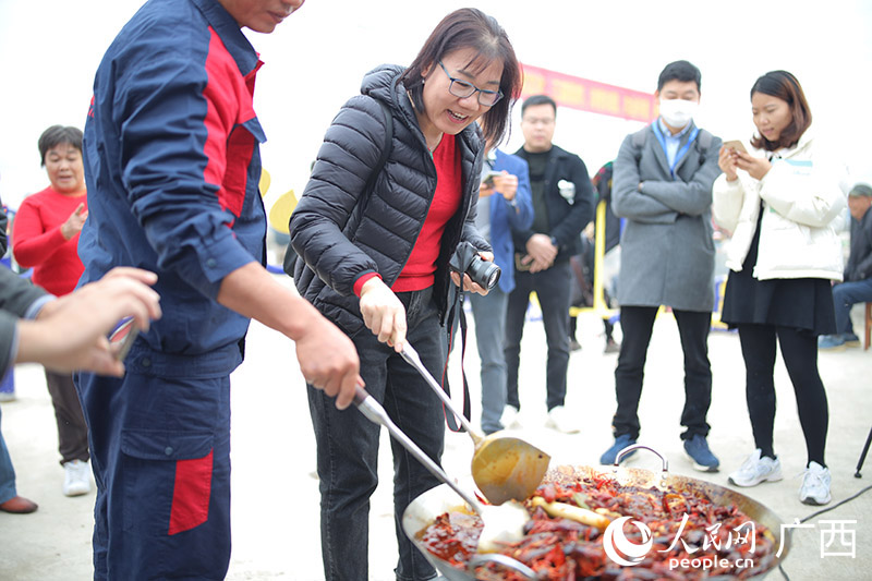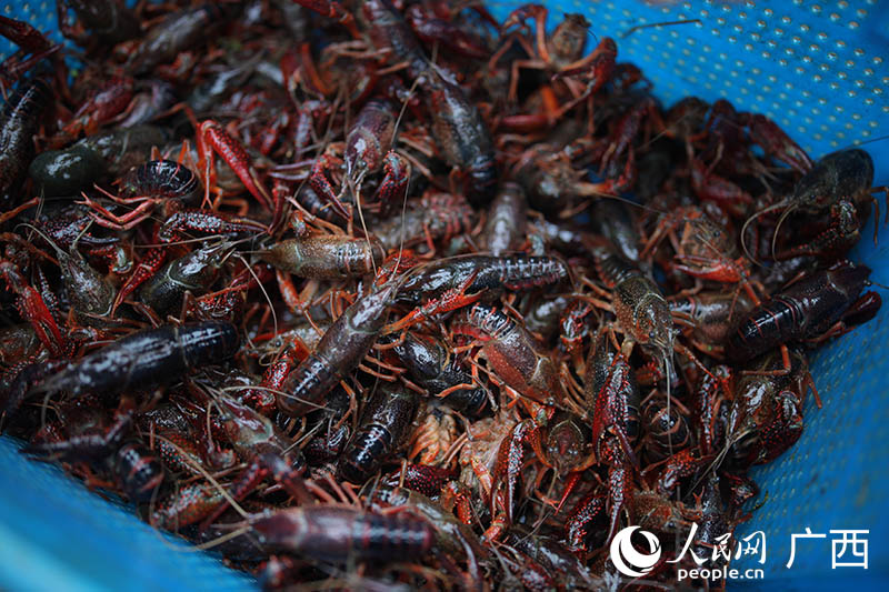 人民网桂平12月15日电 (沈泉池、吴明江)“吃小龙虾不用跑外边卖了,家门口就养有。“12月15日上午,广西贵港桂平市石咀镇旺龙村村民周石清一边在虾塘喂料一边说。去年7月,在外打工多年的她从广东回到家乡,在村口的小龙虾基地上班。“在家里上班能照顾老人小孩,收入也算下来和在外面差不多,非常方便。“周石清对家门口的这份工作十分满意。