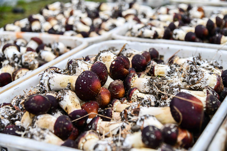 村民穿梭田间挑选采摘成熟的赤松茸。