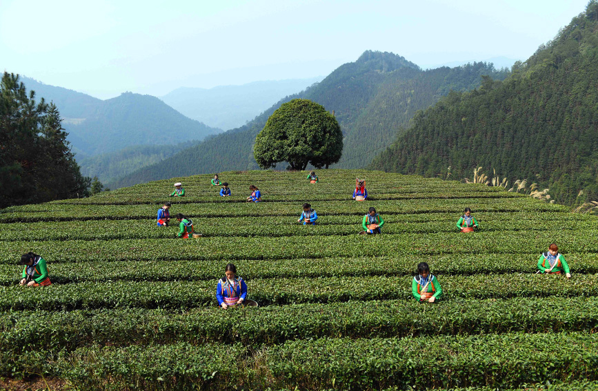时下,正值春茶采摘时节,广西桂林市龙胜各族自治县各地茶园茶叶飘香,茶农趁着晴好天气采摘茶叶。