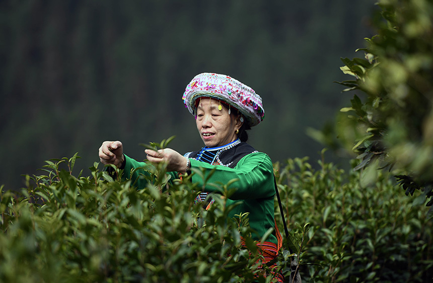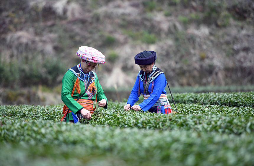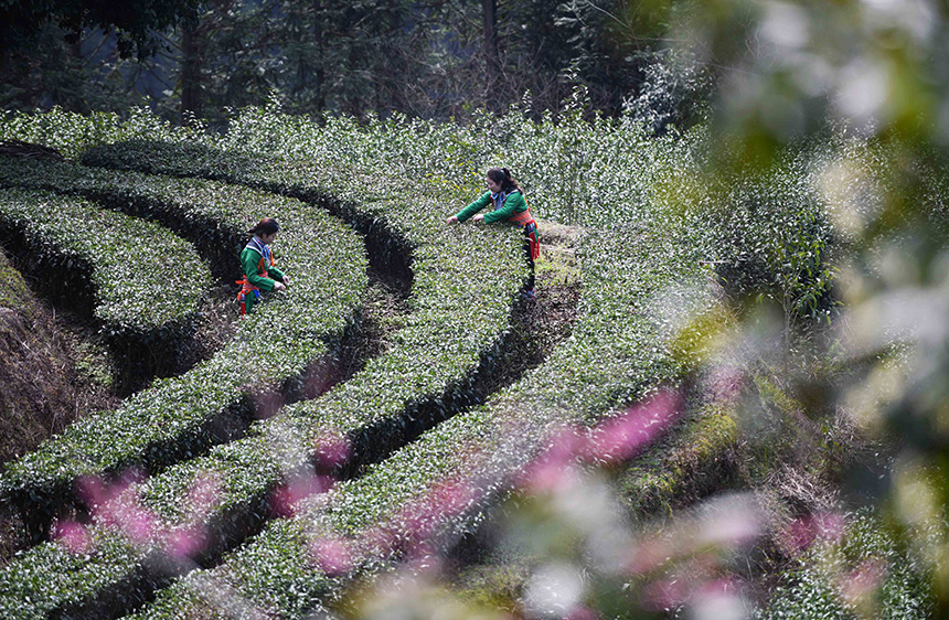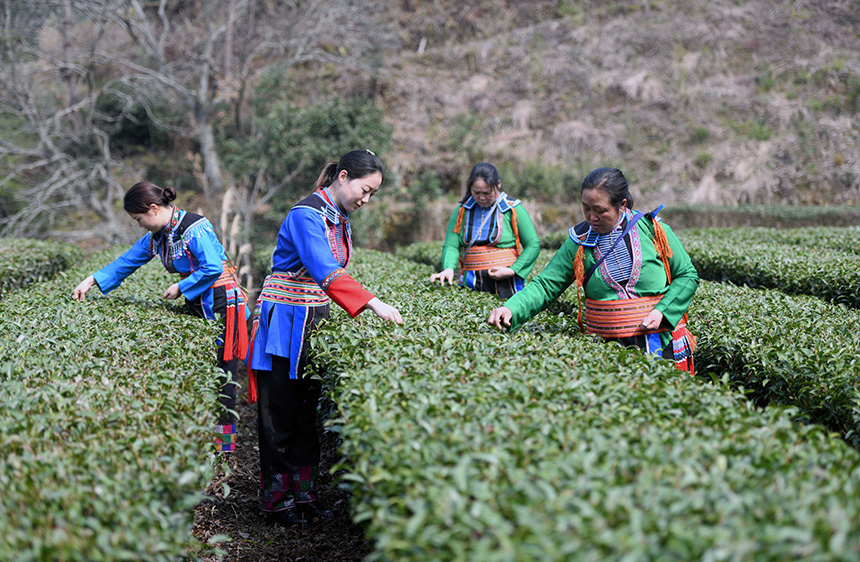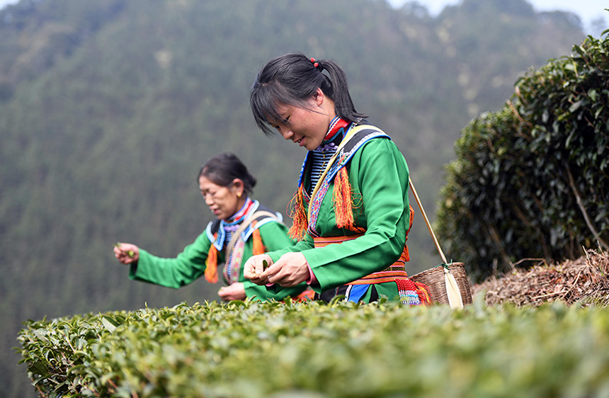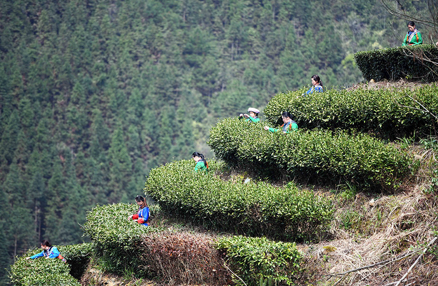 3月2日,在广西龙胜各族自治县江底乡江底村长田组,茶农在采摘茶叶。