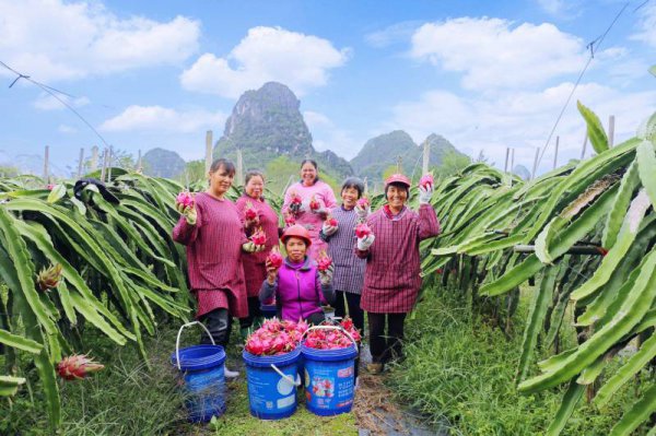 农户们展示刚采收的火龙果。梁玉萍摄 人民网阳朔12月7日电 初冬时节,在广西桂林市阳朔县白沙镇白沙村,该村的晟缘鑫火龙果专业合作社迎来了新一批火龙果的丰收,吸引了客商前来收购,火龙果产销持续火旺,成为了百姓眼中的致富果。 农户们正在采收火龙果。梁玉萍摄 农户们正在将火龙果分拣、...