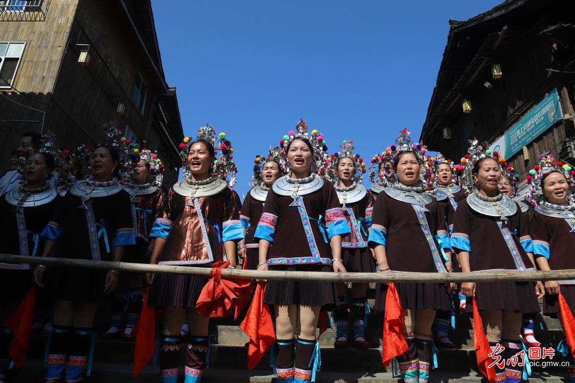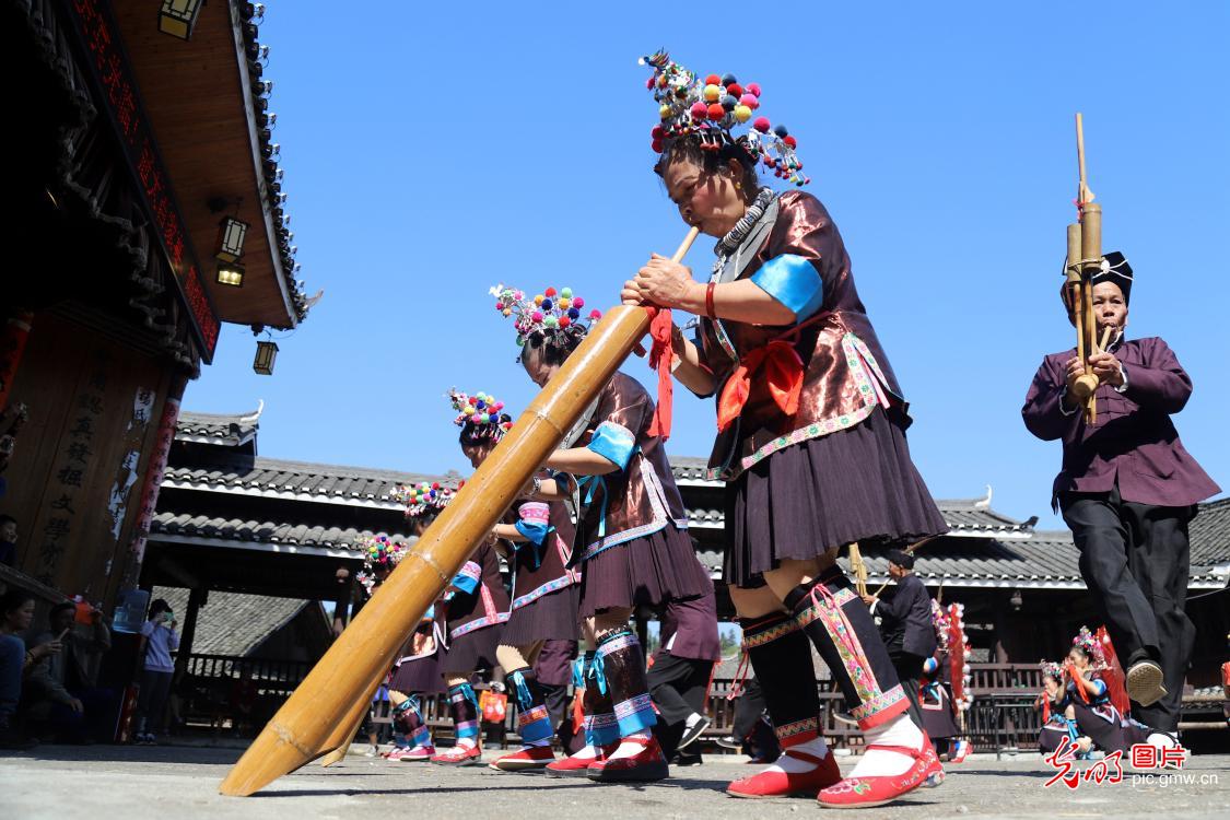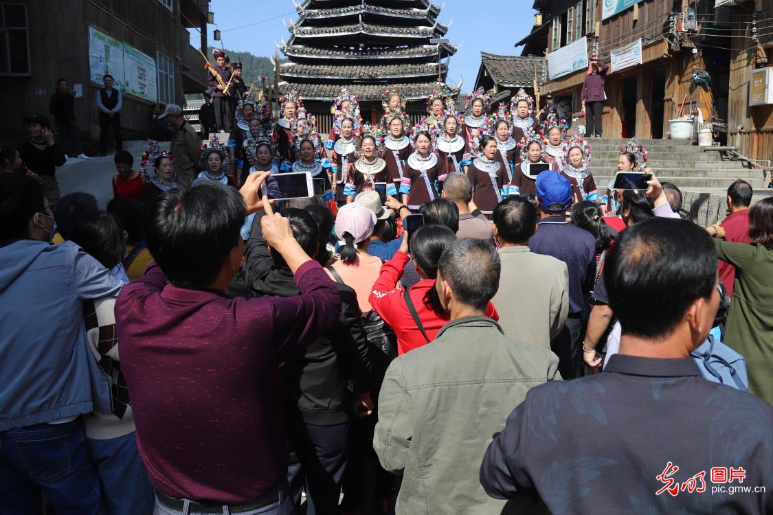 2020年11月8日,广西壮族自治区三江侗族自治县林溪镇冠洞村,村民在给游客表演拦门对歌、吹芦笙、跳踩堂舞。近年来,三江侗族自治县依托美丽的绿水青山、浓郁的民族风情大力发展乡村特色民族文化旅游,促进产业融合发展。(