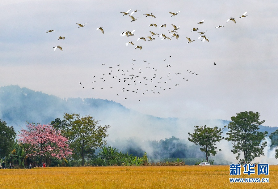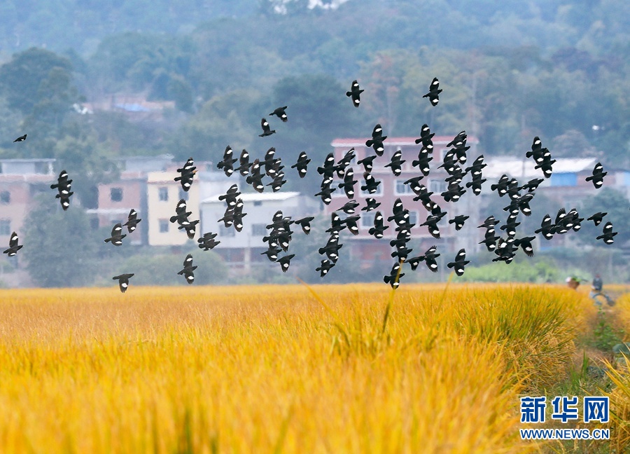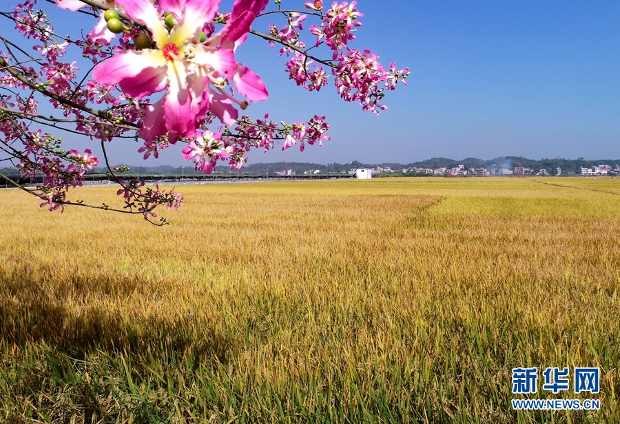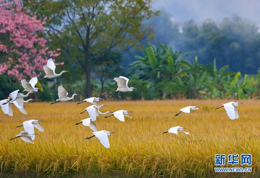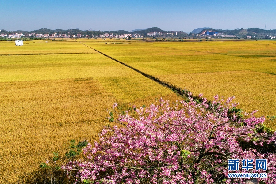 初冬时节,收获的旋律仍在八桂大地上回响。在广西横县,晚稻迎来收获季,广袤的田野里一片金黄,成群的飞鸟掠过金色的稻田,粉嫩的花儿在田边绽放,一台台收割机忙碌穿梭,呈现一幅美丽丰收画卷,令人心醉。