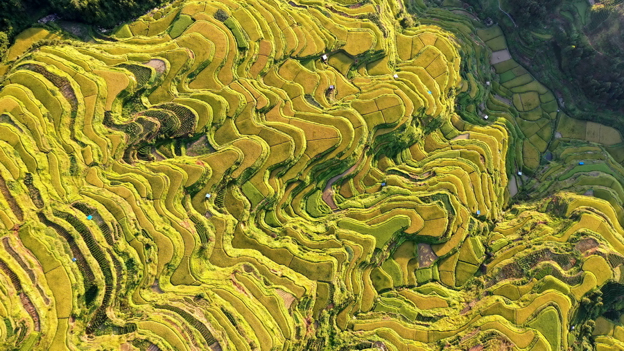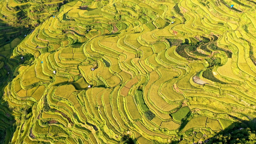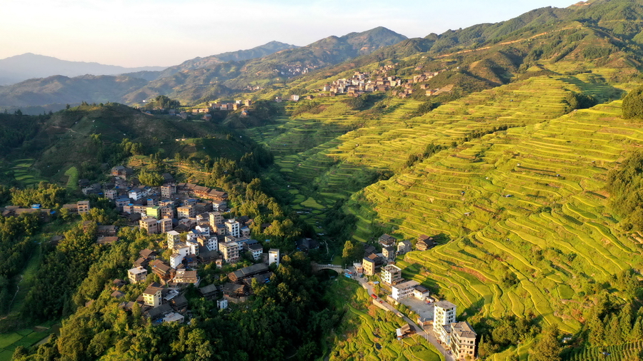 金秋时节,三江侗族自治县同乐苗族乡高武村、桂书村的连片梯田在夕阳的映射下格外金黄,与周边特色民居、翠绿山林、蜿蜒道路交相辉映,构成一幅幅迷人的秋景图,美不胜收。(龚普康)