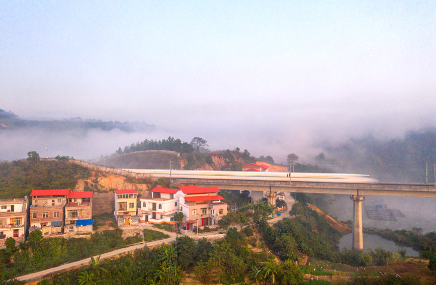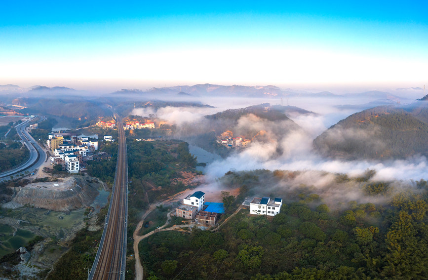 近日,航拍广西梧州市藤县塘步镇六坊村,青山、铁路公路、河流、村庄在云雾间若隐若现,宛如人间仙境。(陈燕、何华文)