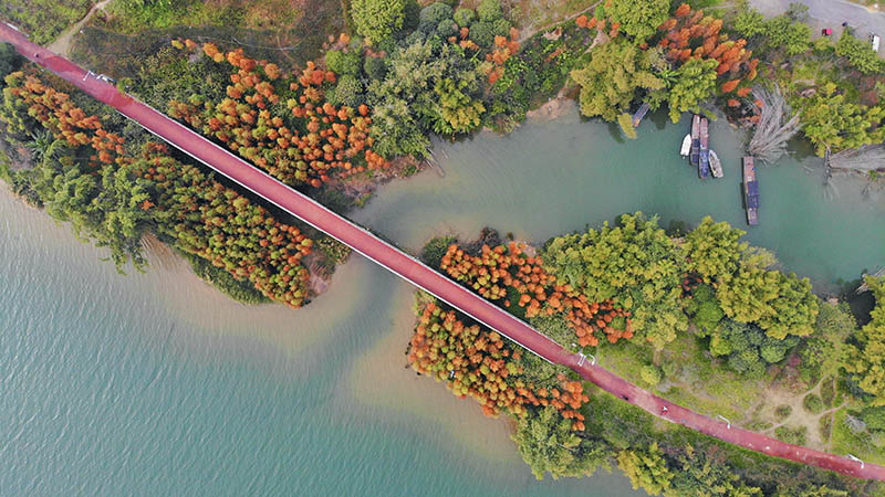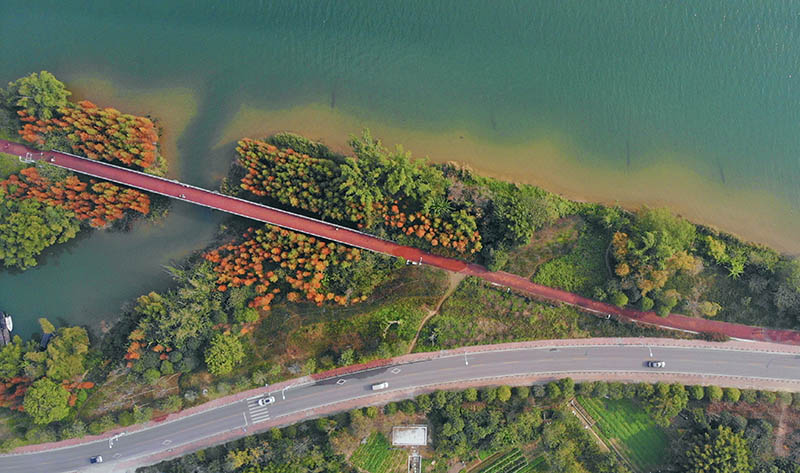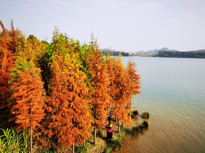 柳州市环江滨水大道黄冲屯附近的水杉穿上“红衣“。付华周摄