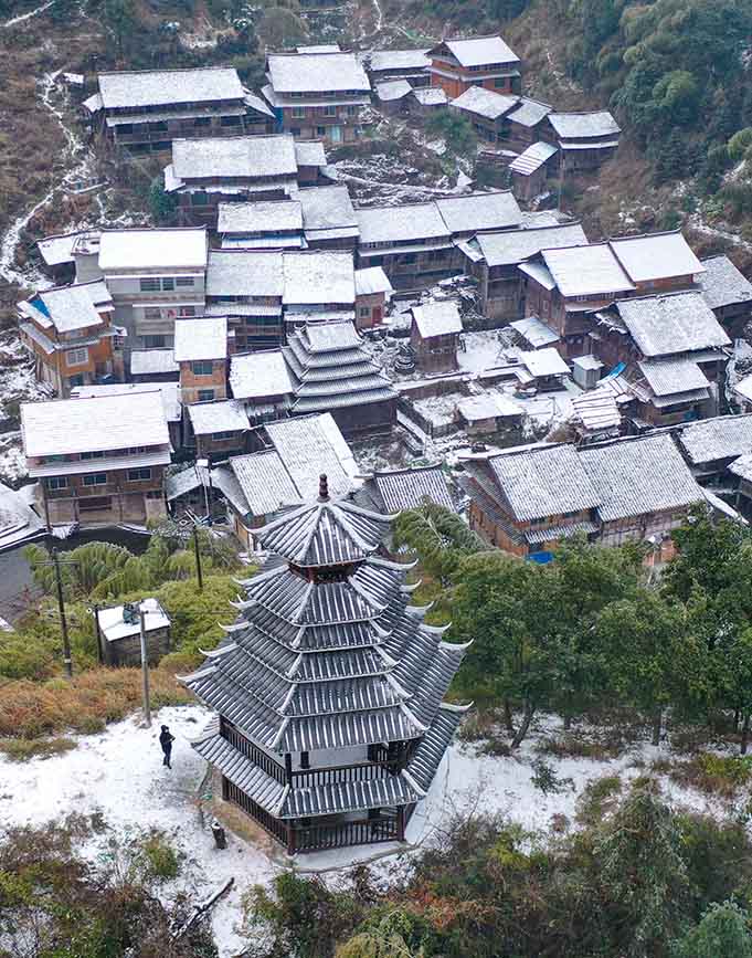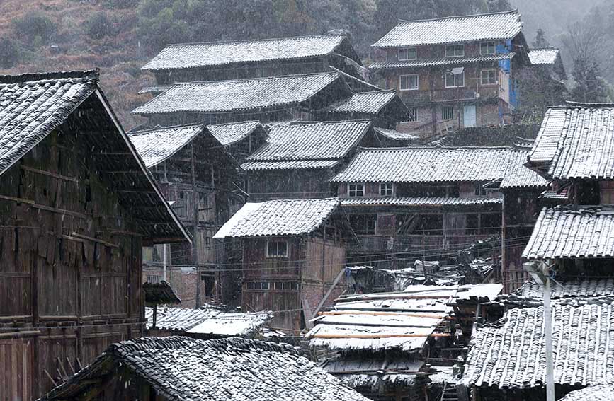 人民网三江12月27日电 日前,受强冷空气影响,广西三江侗族自治县多地迎来入冬后首次降雪,该县独峒镇玉马村高宇屯白雪皑皑,纷飞的雪花与苗寨的鼓楼、廊亭、吊脚木楼等特色建筑相互映衬,宛若童话世界般迷人,美不胜收。(龚普康 吴明江)