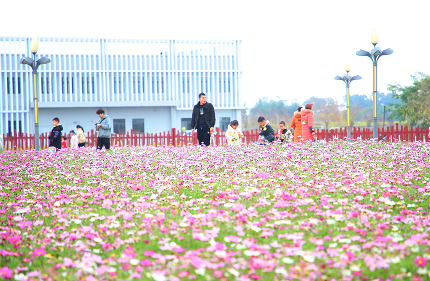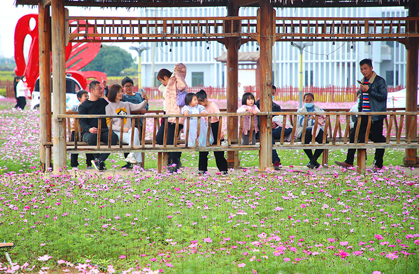 初春时节,春风吹盛了广西横州市的繁花。在当地的中华茉莉园里,大片格桑花迎着料峭春寒绽放,形成旖旎春光中烂漫的花海,引来许多赏花的游客。(彭远贺、陈国海 摄影报道)