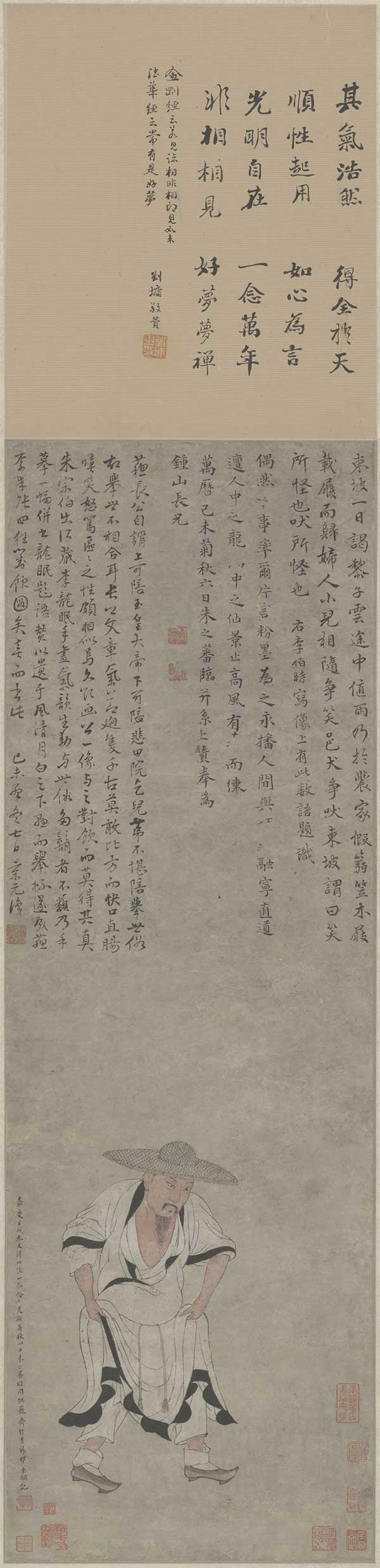 明代一位工书画的大臣朱之蕃也画过苏轼像,作品称作《临李公麟画苏轼像》,这件作品所依据的粉本传为苏轼友人李公麟所作,所以本件作品称“临“为临摹之意。