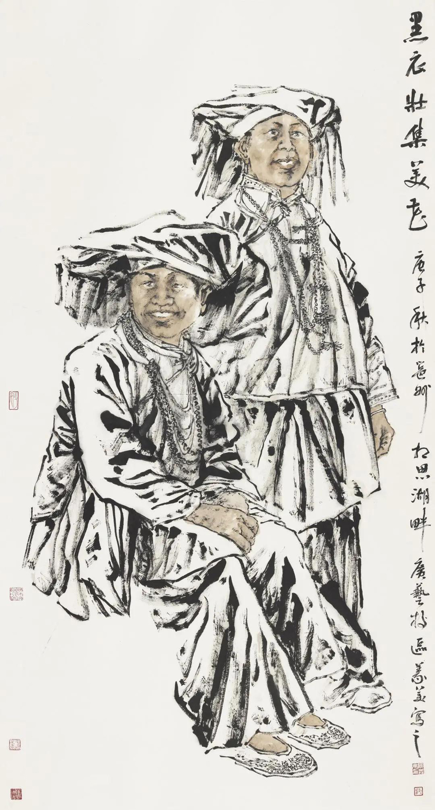 陶义美作为学院派的画家,从早年书法篆刻到后来的线描人物画再到近几年的山水画艺术创作。艺术家的个体发展既与地域发展结合,又需要个人大胆创新的自我蜕变,这在漓江画派艺术家中表现得尤为显著。陶义美主攻中国人物画创作,在人物画创作中他又选择了“线描“。线描,即称白描,是用毛笔、墨、宣纸、中国画颜料等材料,通过勾勒、设单色的方式表现客观物象的画种。看似简单,实则很难。一根线条蕴含着抑扬顿挫的节奏感与生命力,浓淡不一的墨色,增加了画面的层次感与丰富性。陶义美的线描人物画作品多表现的是广西的少数民族人物,尤其以苗族、壮族为代表。他经常到广西少数民族较为集中的德峨、南丹、融水等地采风、写生,与当地村民乡亲同吃同住,与他们聊天、畅饮,了解他们的生活方式,感受他们的民族情感与精神,收集与积累了大量的创作素材与资料。满脸皱纹、沧桑淳朴的老人,美丽大方、纯情温柔的姑娘,生龙活虎、血气方刚的小伙儿,还有天真无邪、稚幼可爱的小孩,这些少数民族人物形象跃然于纸上,生动传神。他们或歌舞、或劳作、或休息、或赶圩、或凝思……,把少数民族人民的勤劳、质朴以及他们原始、粗旷、民族的独特美通过线描艺术演绎的淋漓尽致。
