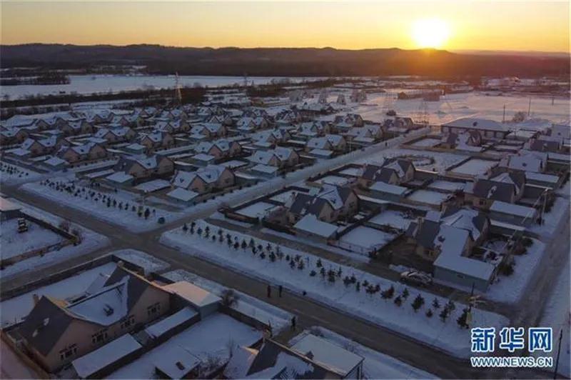 1月17日,夕阳下的黑龙江塔河县十八站鄂伦春民族乡鄂族村(无人机照片)。新华社 张涛 摄