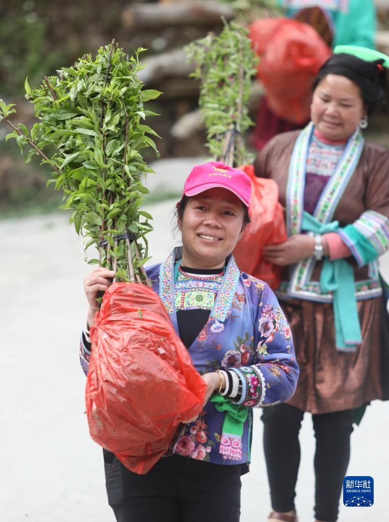 3月17日,在广西柳州市融水苗族自治县杆洞乡党鸠村,村民领取爱心树苗,准备上山种植。