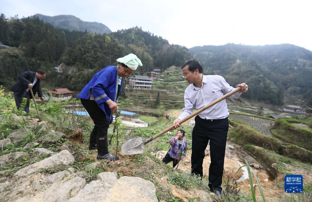 3月17日,在广西柳州市融水苗族自治县杆洞乡党鸠村,纪检监察干部(右一)和村民在山上种树。