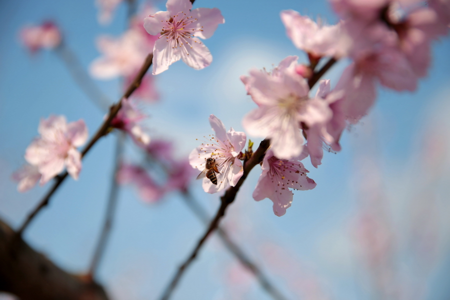 盛放的桃花引来蜜蜂花间飞舞 韦睿摄