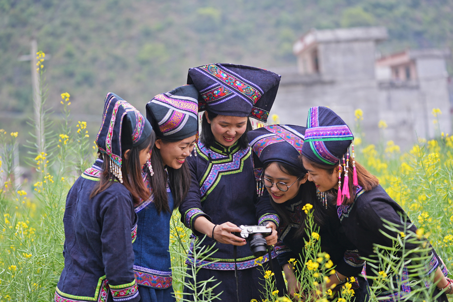 游客穿着民族服装在油菜地里赏花。黄少将 摄