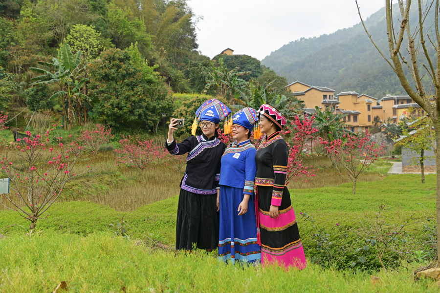 在花间,村民和游客们穿着民族盛装三三两两在赏花游玩,拍照留影,徜徉在花海中,既欣赏了大自然的美景,又放松了身心,愉悦了心情。