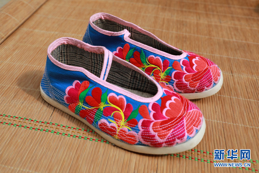 除了制作土布壮衣,德周村妇女还会制作传统千层底布鞋,从切底、包边、粘合、圈底、纳底到制作完成,其间经历多道工序。做好的千层底布鞋里,既有传统的黑色方口鞋,也有精致的女士绣花鞋,其中不少鞋子在经典造型的基础上,被融入更多现代元素,在视觉呈现上更加美观。