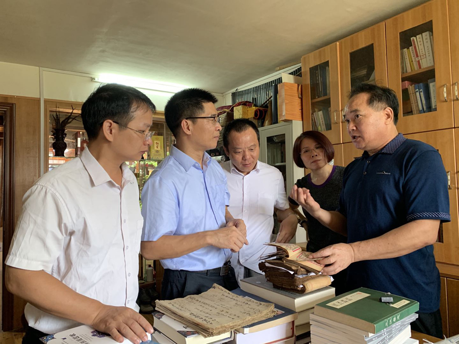 杨会光(右一)向专家学者介绍古籍搜集情况。(杨兰桂 摄)