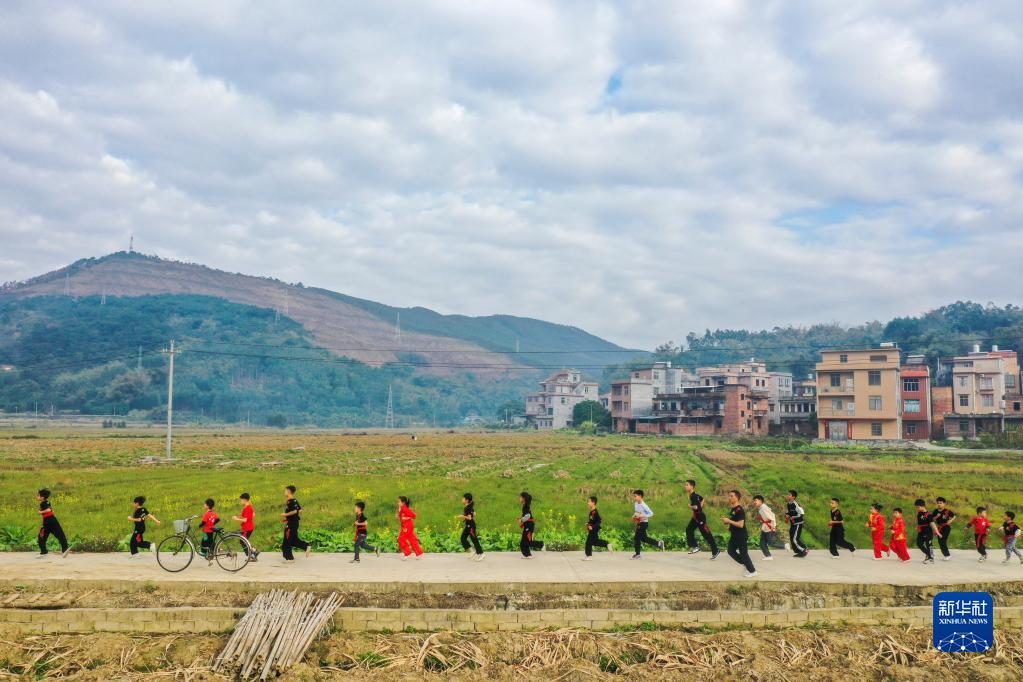 2月2日,在广西兴业县石南镇东周村,教练带领孩子们跑步热身(无人机照片)。