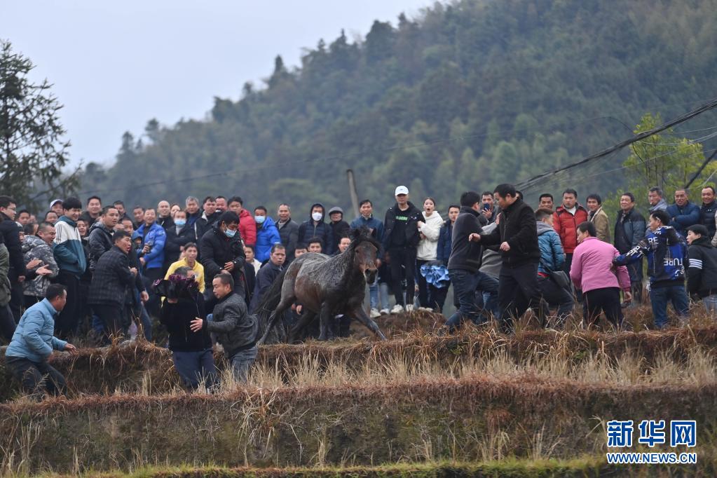 这是融水苗族自治县香粉乡十六古龙坡会斗马比赛现场(2月6日摄)。