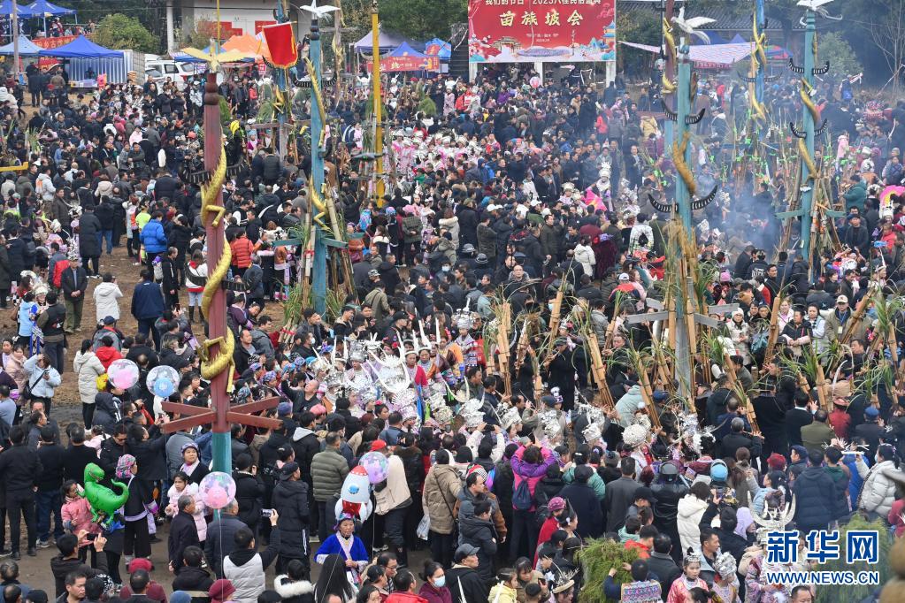 2月6日,在融水苗族自治县香粉乡十六古龙坡会上,当地群众和游客在观赏表演(无人机照片)。