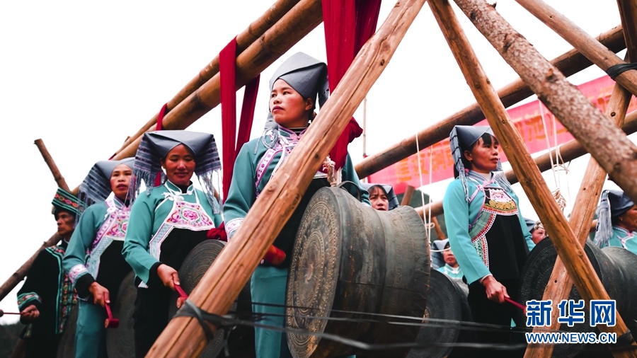 铜鼓阵阵,闹春祈福。立春时节,在广西东兰县长江镇河口、三弄瑶族乡弄宁瑶寨、巴畴乡巴英村等地,陆续举行红水河铜鼓山歌会、非遗节目展演、“壮族蚂拐节”立幡活动,数百面铜鼓在红水河畔敲响春天的音符,祈求新的一年,风调雨顺,五谷丰登。