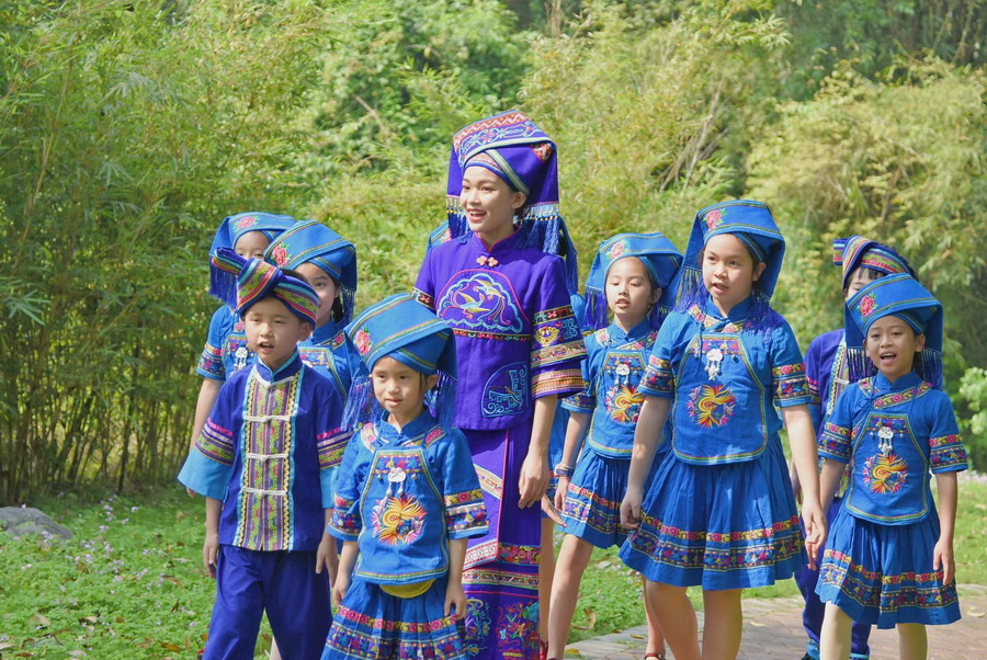 假期回到广西,奚溪李也没有停下传唱山歌的步伐。2020年,她接受广西卫视《民族文化》栏目的邀请,参加《山歌代代传》专题片的录制。2021年,以“云课堂”“云支教”的形式给河池市都安瑶族自治县高岭镇加全小学的孩子们上了一堂音乐启蒙课。恰逢中国共产党成立100周年,奚溪李教孩子们演唱《唱支山歌给党听》,同时用壮、汉语双语教孩子们演唱富有壮族韵味的《敬酒歌》。