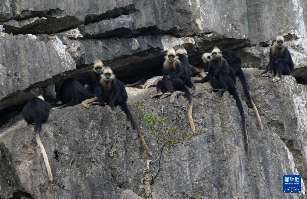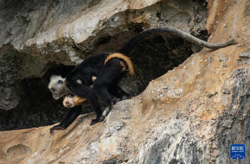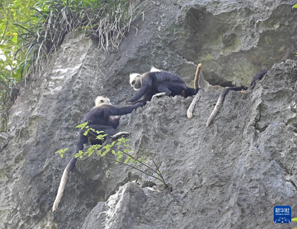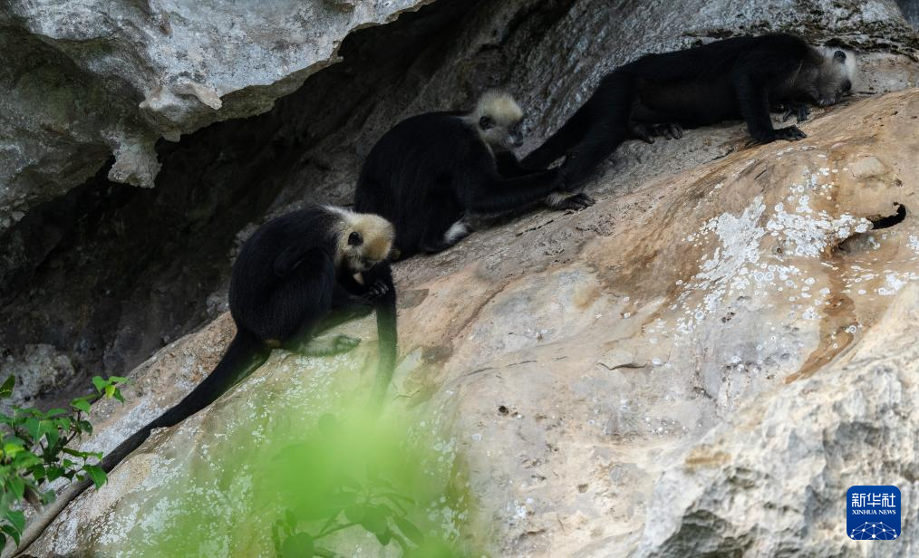 三只白头叶猴在岩壁上休憩(8月5日摄)。