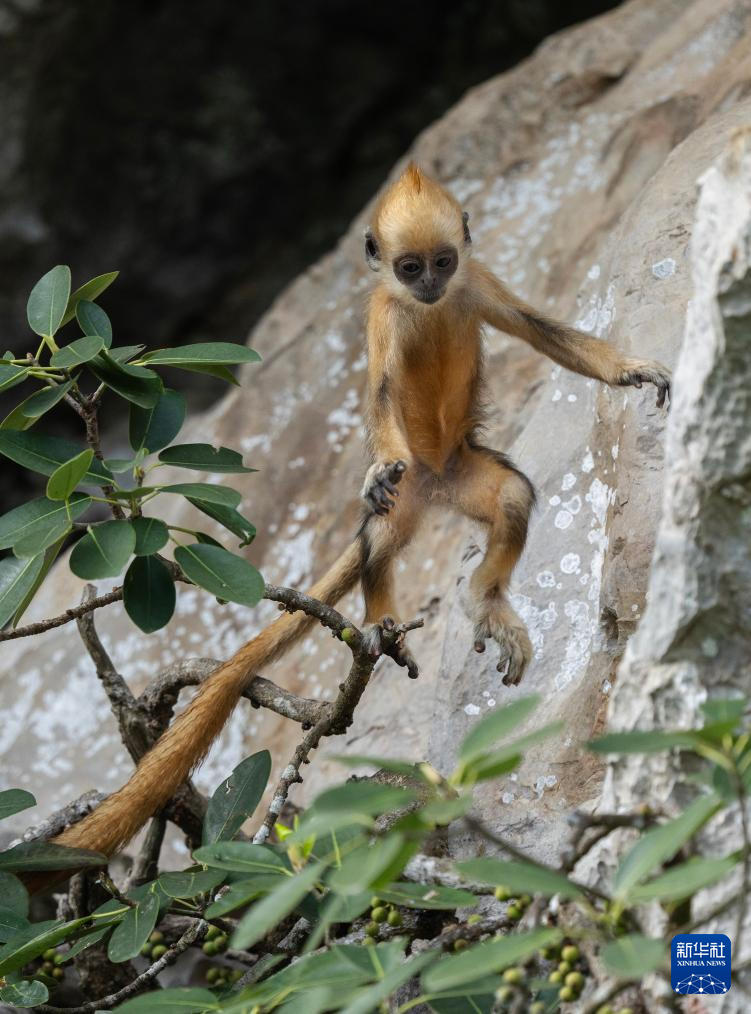 一只白头叶猴在攀岩转场觅食(8月5日摄)。