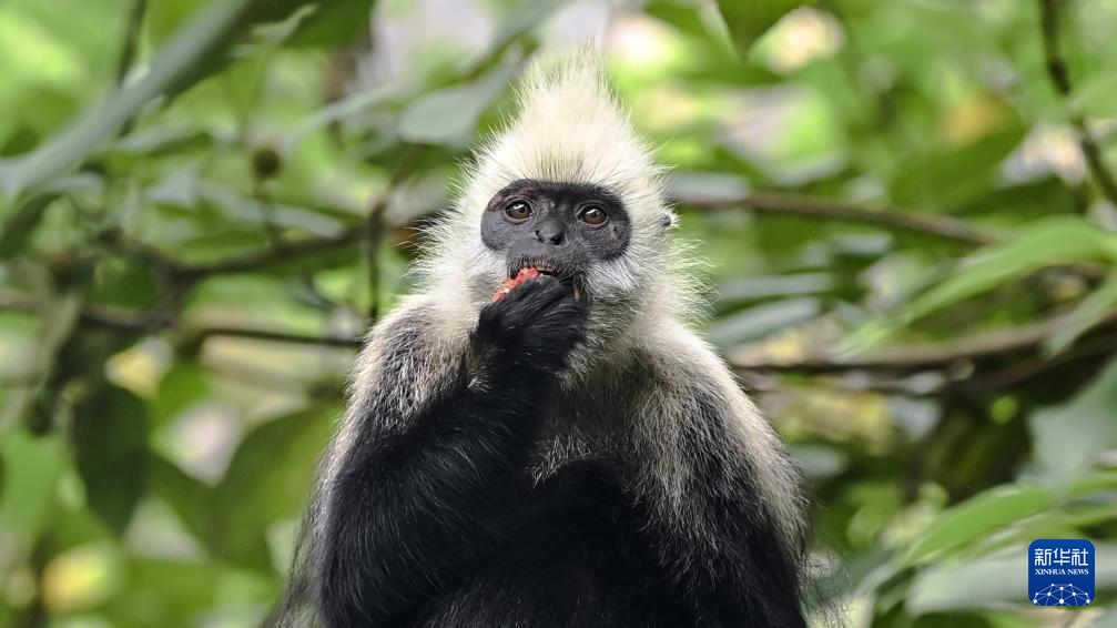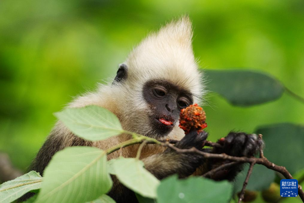 一只白头叶猴在食用鲜果(8月4日摄)。
