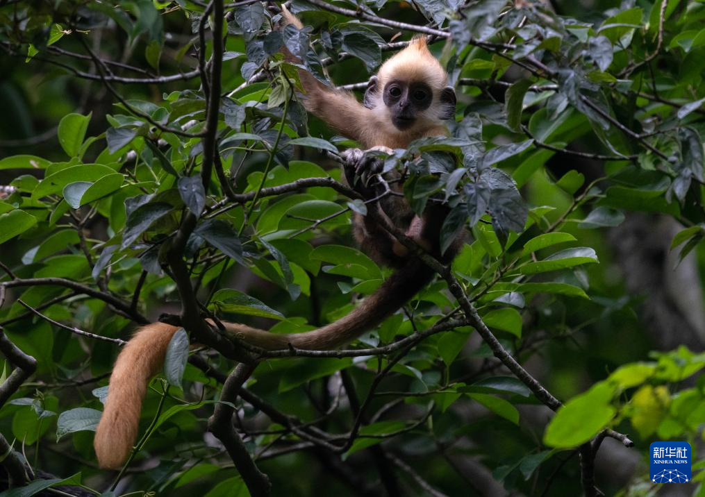 一只白头叶猴幼猴在树上张望(8月5日摄)。