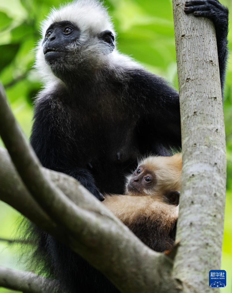 一只白头叶猴带着幼猴觅食(8月4日摄)。