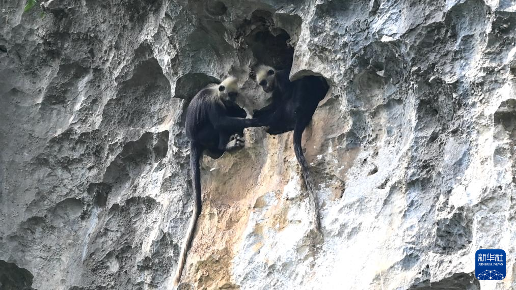 两只白头叶猴在岩壁上休憩(8月5日摄)。
